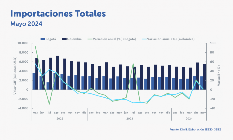 Published in: Boletines Las importaciones de manufacturas en Bogotá aumentaron 1,7 % en mayo de 2024 Author Observatorio Economico Published on: 1 de agosto de 2024 Destacados: Las importaciones de manufacturas crecieron 1,7 % en mayo de 2024, mientras que los bienes primarios registraron una caída anual de 12,6 %. En mayo se observó un crecimiento anual de 33,5 % en las compras externas de refinación de petróleo. Las importaciones desde México en mayo presentaron un aumento de 9,3 % frente al mismo mes de 2023. Archivo de descarga: Boletín Importaciones No. 143 Temas:Importaciones Tipo de Publicación: Boletines