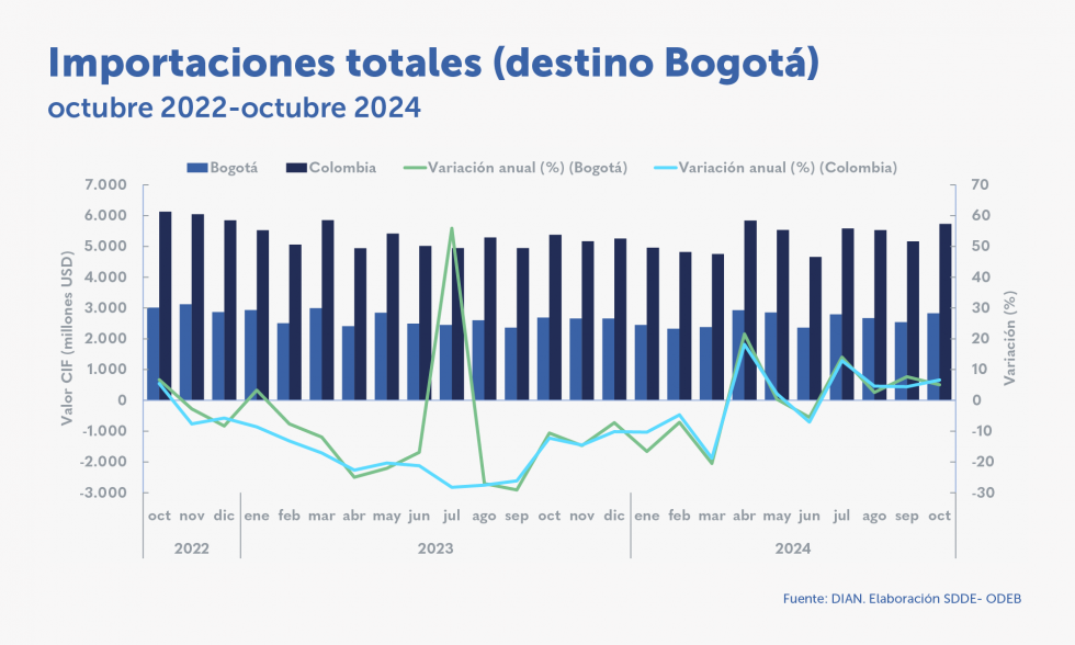 Published in: Boletines Las importaciones de Bogotá crecieron 5,1 % en octubre de 2024 Author Observatorio Economico Published on: 16 de enero de 2025 Destacados: Las importaciones de manufacturas registraron un incremento anual de 10,5 %, mientras que los bienes primarios disminuyeron 37,1 % en octubre de 2024.En octubre se observó un crecimiento anual de 35,9 % en las compras externas de productos informáticos. Las importaciones desde China y Brasil en octubre presentaron un aumento de 38,3 % y 30,4 % frente al mismo mes de 2023. Archivo de descarga: Boletín Importaciones No. 148 Temas: Importaciones Tipo de Publicación: Boletines