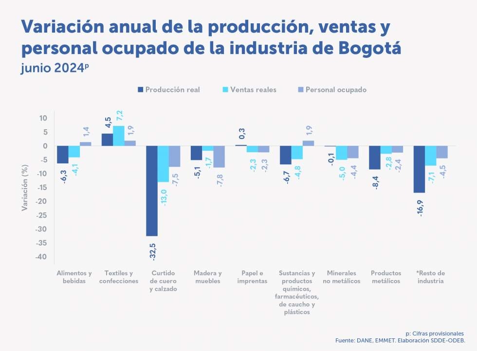• La variación anual de la producción real en Bogotá decreció 7,0 % respecto a junio de 2023.