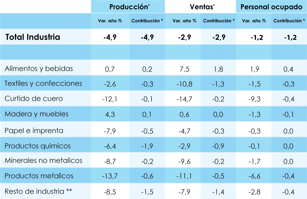 Published in: Boletines La producción de Bogotá se ubicó en -4,9% en noviembre de 2019 Author Observatorio Economico Published on: 31 de enero de 2020 Destacados: Año corrido a noviembre la producción aumentó enalimentos y bebidas 8,7%curtido de cuero y calzado 8,4%papel e imprentas 5,9%madera y muebles 2,6% Archivo de descarga: Boletín INDUSTRIA No.45 Temas: Industria. Tipo de Publicación: Boletines