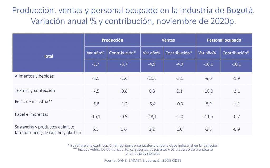 Entre los meses de marzo y noviembre de 2020, se registró la menor variación negativa de la industria de la ciudad, que evidencia una leve recuperación de la producción.