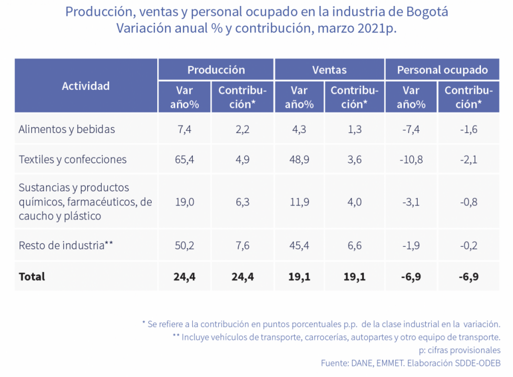 En el primer trimestre de 2021 la producción industrial de la ciudad incrementó en 2,9 % resultado del comportamiento positivo de: resto de industria, sustancias y productos químicos, farmacéuticos, de caucho y plástico y textiles y confecciones.