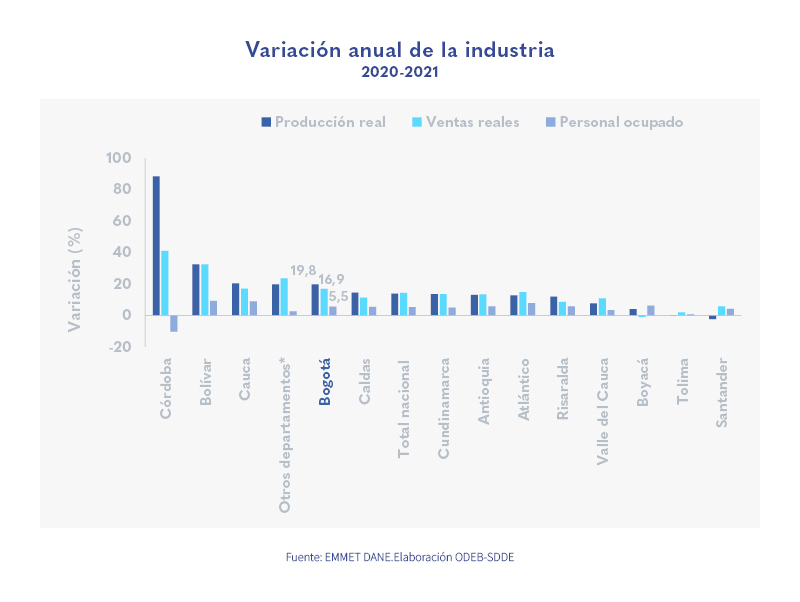 Published in: Boletines Sigue repunte en producción, ventas y personal ocupado de la industria bogotana Author Observatorio Economico Published on: 15 de febrero de 2022 Destacados: La producción real aumentó en 19,8 % anual a noviembre del 2021.Las ventas reales crecieron 18,5 % desde enero hasta noviembre del 2021. El personal ocupado repuntó con un incremento en 5,5 % anual a noviembre del 2021. Archivo de descarga: Boletín INDUSTRIA No.69 Temas: Industria. Tipo de Publicación: Boletines