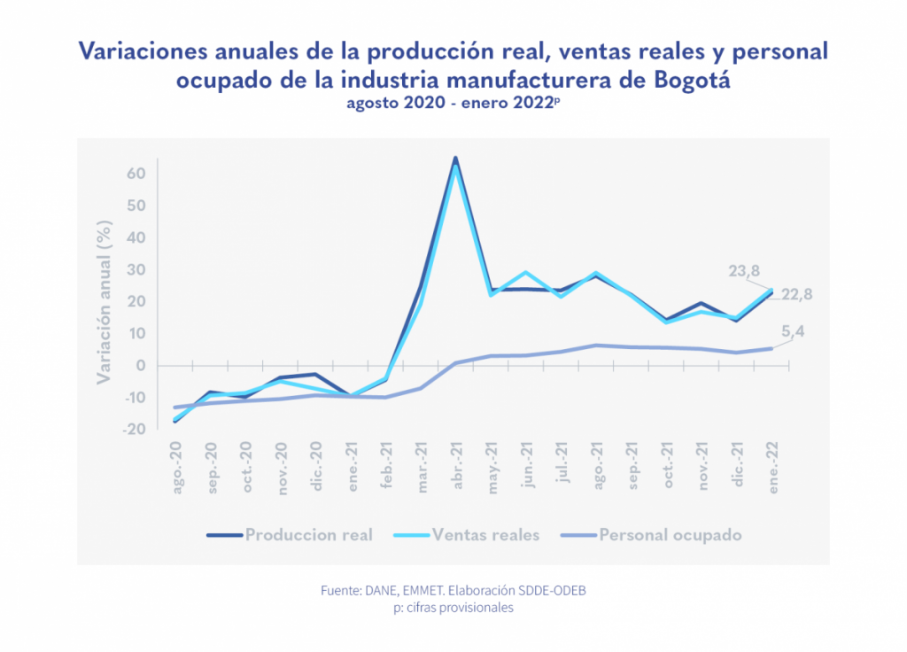 En enero de 2022, Bogotá fue la ciudad con mayor aporte al crecimiento de las ventas reales de la industria en la nación, con 3,2 puntos porcentuales (p.p.).