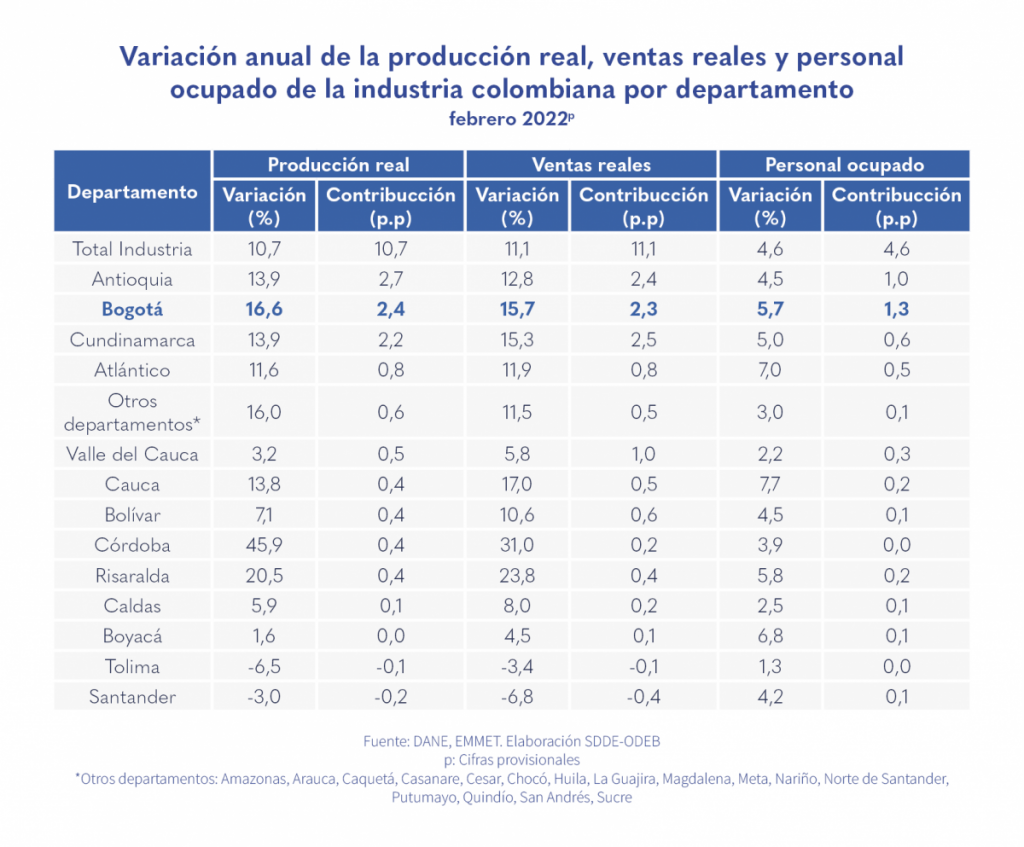 La producción, las ventas y el personal ocupado en Bogotá tuvieron un incremento anual positivo de 16,6 %, 15,7 % y 5,7 % respectivamente.