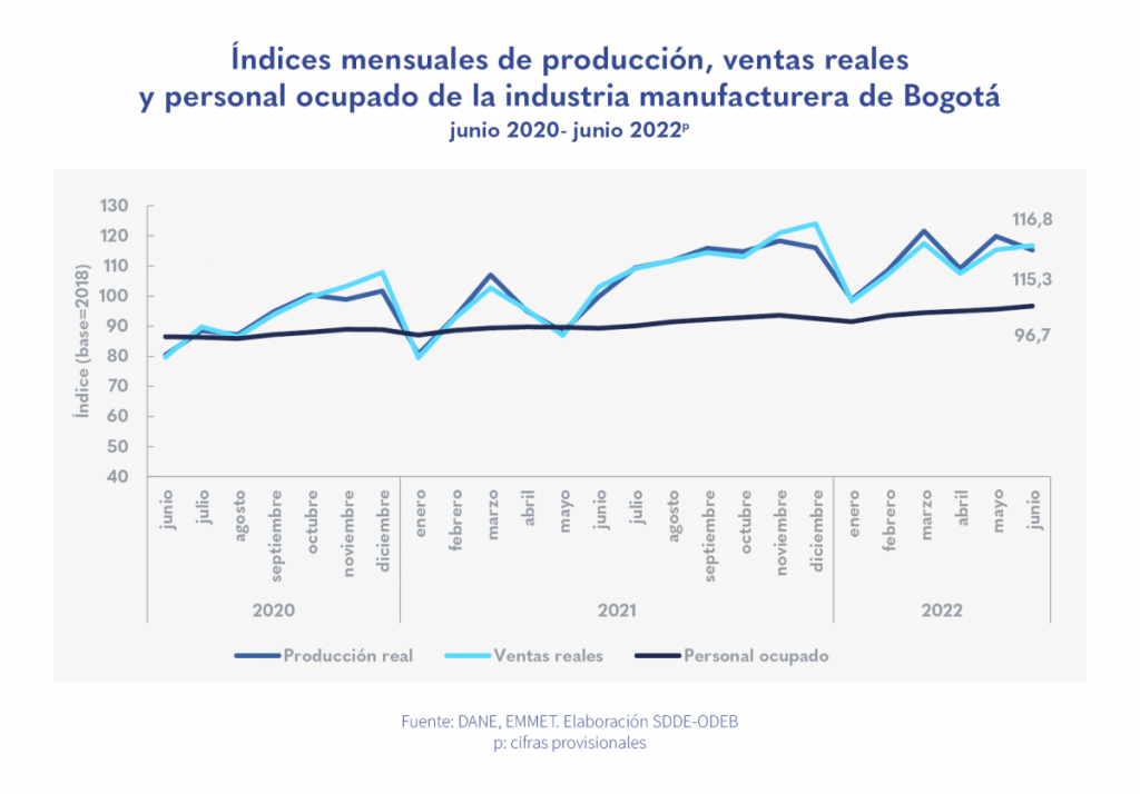 Para el mes de junio de 2022, la industria bogotana alcanzó los niveles de producción y ventas reales, comparado con junio de 2019, año prepandemia.