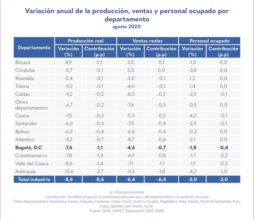 Bogotá presentó reducciones en el personal ocupado en la industria, la producción real y las ventas reales