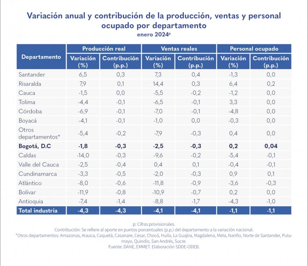 Published in: Boletines En enero de 2024 aumentó el personal ocupado de la industria en Bogotá Author Observatorio Economico Published on: 5 de abril de 2024 Destacados: La variación anual de la producción real de la capital estuvo 2,4 puntos porcentuales (p.p.) por encima del valor del nivel nacional. El sector textil y de confecciones fue el que más contribuyó a las variaciones de la producción y ventas reales de la ciudad. La variación anual del personal ocupado fue de 0,2 % para Bogotá. Archivo de descarga: Boletín industria No.95 Temas: Industria. Tipo de Publicación: Boletines