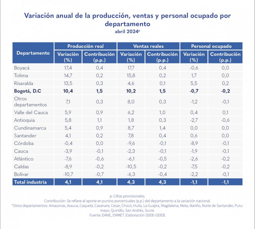 La variación anual de la producción real en Bogotá creció en 10,4 % respecto a abril de 2023.