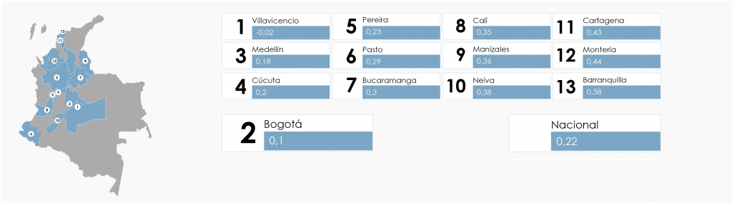 Published in: Boletines Bogotá registró la segunda inflación más baja de las ciudades principales Author Observatorio Economico Published on: 11 de agosto de 2019 Destacados: Con la inflación de julio, Bogotá acumula un aumento del IPC de 2,67% Archivo de descarga: Boletín inflación No.100 Temas: Inflación y gasto. Tipo de Publicación: Boletines