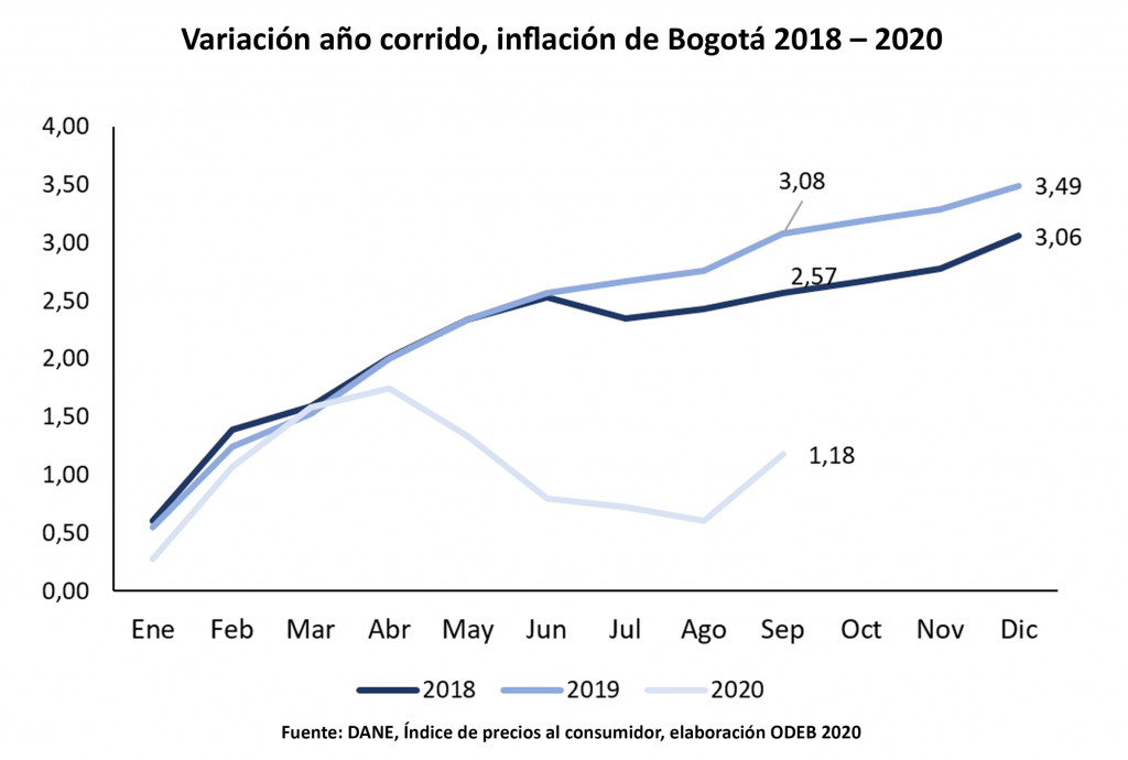 Published in: Boletines A septiembre la inflación año corrido de Bogotá fue de 1,18% Author Observatorio Economico Published on: 19 de octubre de 2020 Destacados: La inflación del mes de septiembre en Bogotá, fue de 0,57%, resultado del aumento de los precios en información y comunicaciones en 2,76%. Archivo de descarga: Boletín inflación No.114 Temas: Inflación y gasto. Tipo de Publicación: Boletines