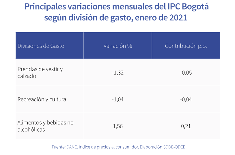 • Santa Marta con 0,05 % y Tunja con 0,28 % acompañan a Bogotá con la menor variación en enero de 2021.