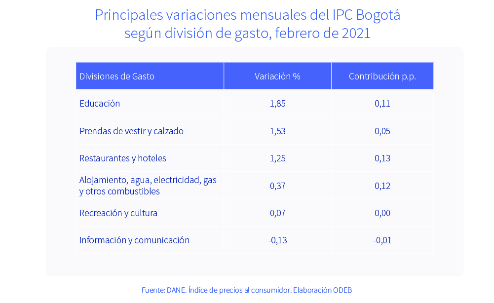Published in: Boletines En febrero de 2021, Bogotá registró una inflación de 0,65 % inferior a la de febrero de 2020 Author Observatorio Economico Published on: 11 de marzo de 2021 Destacados: En la ciudad las actividades de, educación, prendas de vestir y calzado, hoteles y restaurantes registraron incrementos durante febrero de 2021.Información y comunicaciones con -0,13 %, presentó la menor variación de precios al consumidor en la ciudad con respecto al mes anterior.La eliminación de pico y cédula permitió la reactivación económica gradual en restaurantes.La inflación año corrido a febrero en Bogotá se situó en 0,91 %, siendo menor a la de la nación que se ubicó en 1,05 %. Archivo de descarga: Boletín inflación No.119 Temas: Inflación y gasto. Tipo de Publicación: Boletines