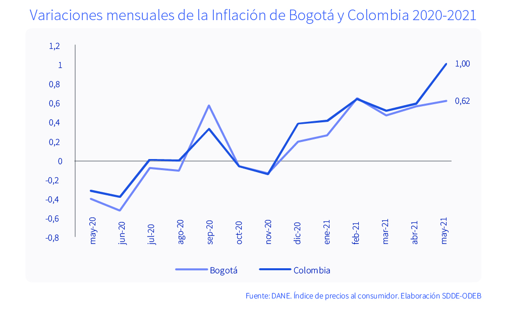 La inflación año corrido a mayo en la capital se situó en 2,59 %, mayor a la registrada en el mismo periodo en 2020 (1,50 %).