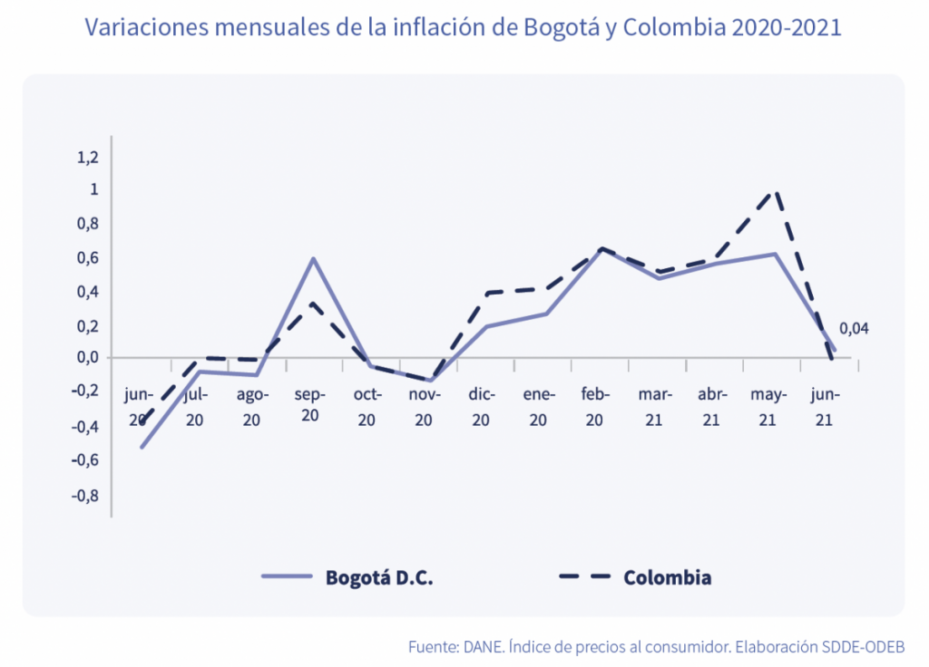 Published in: Boletines La economía bogotana mostró signos de recuperación con un crecimiento del IPC de 0,04 % en junio Author Observatorio Economico Published on: 16 de julio de 2021 Destacados: El sector de restaurantes y hoteles registró el mayor ascenso en los precios en junio de 2021 respecto a junio de 2020 en 0,58 %.Los precios de la división de alimentos y bebidas no alcohólicas descendieron 0,57 % principalmente por la disminución de 4,41 % en las frutas. Archivo de descarga: Boletín inflación No.123 Temas: Inflación y gasto. Tipo de Publicación: Boletines