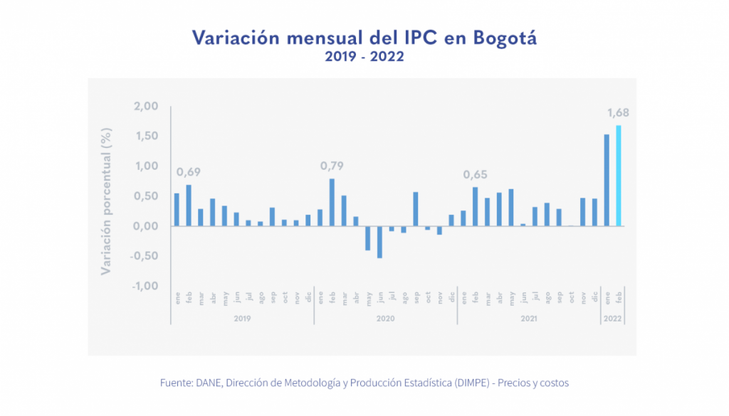 La variación mensual del índice de precios al consumidor (IPC) en Bogotá fue de 1,68 % en el mes de febrero; la más alta de los últimos cuatro años.