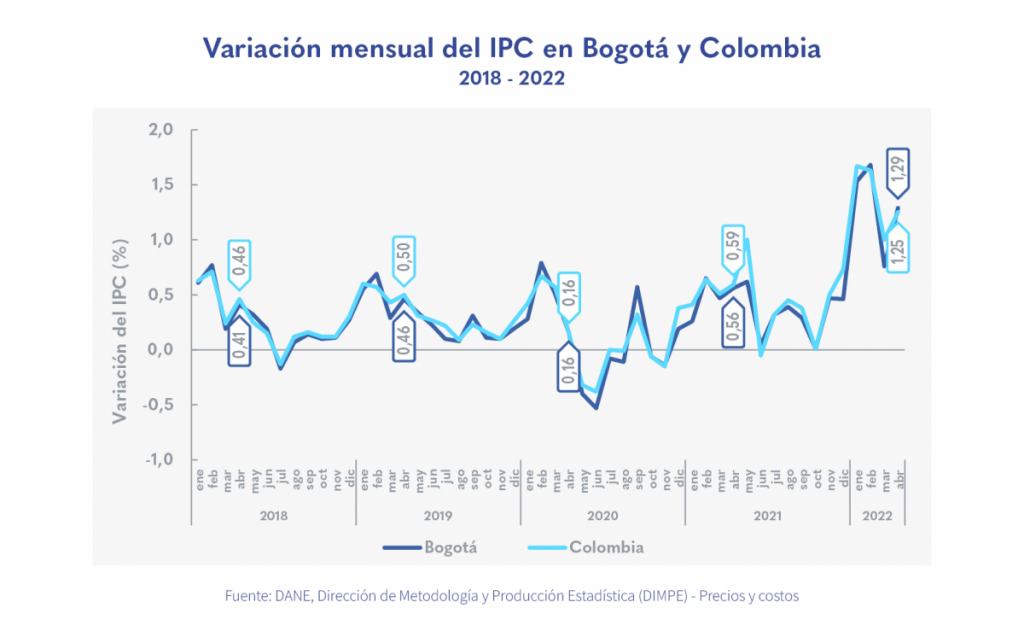 La variación mensual del índice de precios al consumidor (IPC) en Bogotá fue de 1,29 % en el mes de abril; la más alta con relación al mismo periodo en los últimos cuatro años.