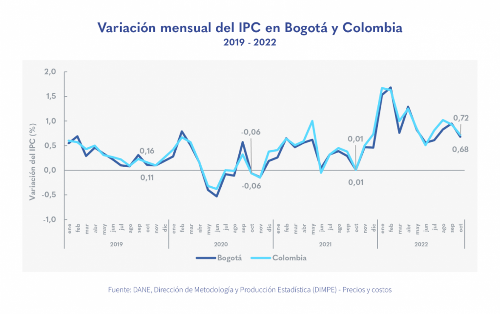 En lo corrido del año, la inflación va en 10,14 %, 7,14 puntos porcentuales (p.p.) por encima de la meta fijada por el Banco de la República.