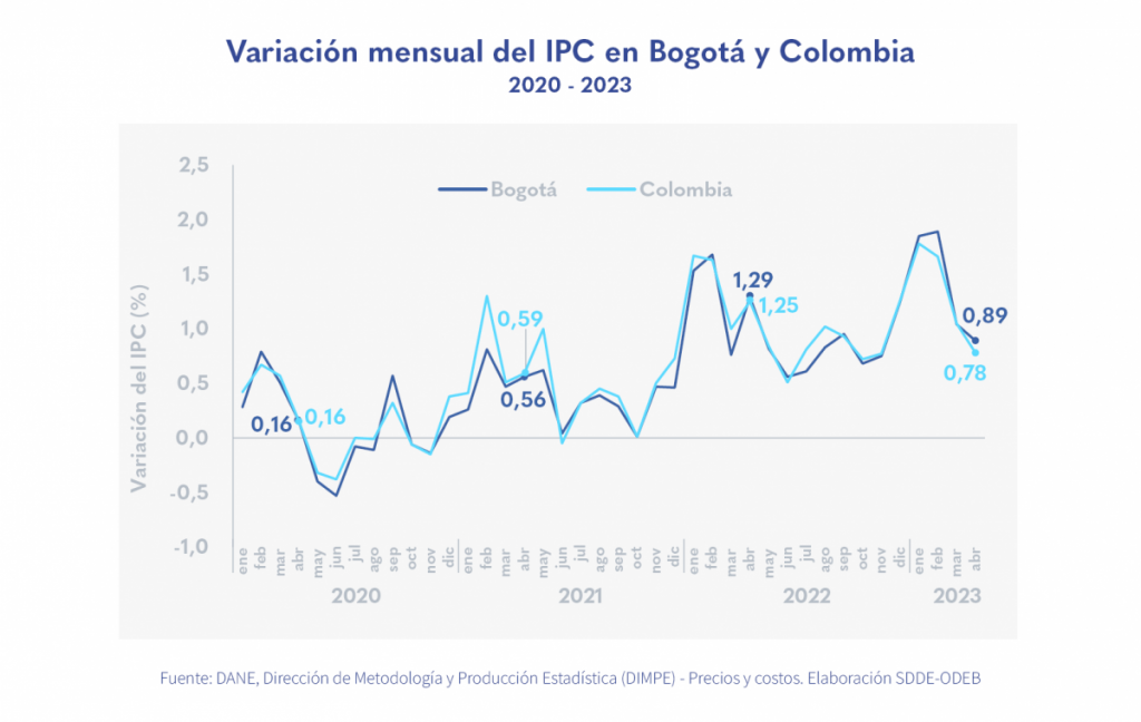 Published in: Boletines La inflación de la capital en abril de 2023 es la más baja de los últimos meses Author Observatorio Economico Published on: 10 de mayo de 2023 Destacados: La inflación de abril de 2023 en Bogotá estuvo solo 11 puntos básicos por encima del total nacional.La inflación año corrido enero-abril de 2023 va en 5,80 %, 2,8 p.p. por encima de la meta de largo plazo fijada por el Banco de la República.Por primera vez en los últimos meses, la división de los alimentos no explica fundamentalmente el incremento de los precios en la capital. Archivo de descarga: Boletín inflación No.144 Temas: Inflación y gasto. Tipo de Publicación: Boletines
