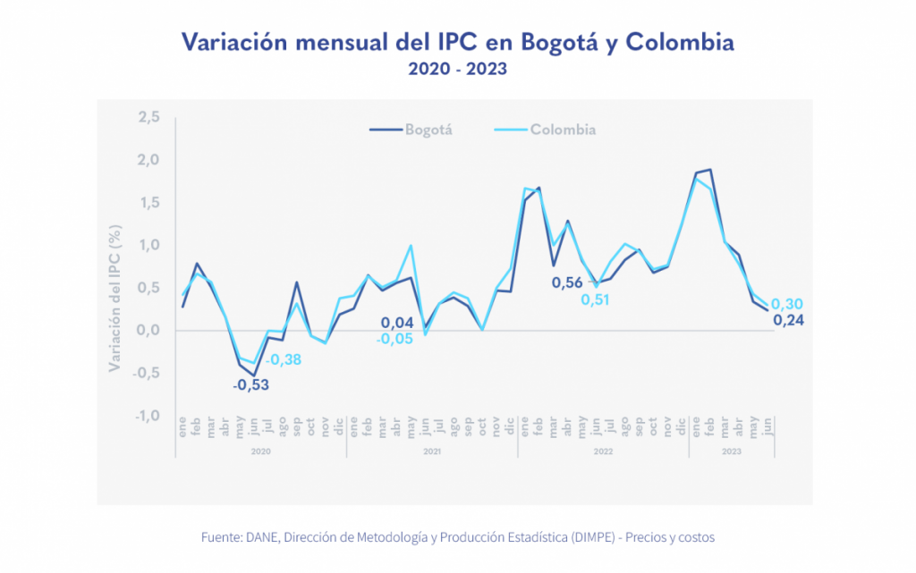 Published in: Boletines La inflación de la capital en junio de 2023 siguió cayendo Author Observatorio Economico Published on: 14 de julio de 2023 Destacados: La inflación en junio de 2023 en la capital estuvo 0,06 puntos porcentuales (p.p.) por debajo del total nacional. En lo corrido de este año, el incremento del IPC en Bogotá fue de 6,42 %, 3,42 p.p. por encima de la meta fijada por el Banco de la República. Transporte y bebidas alcohólicas explicaron el alza mensual, mientras que los alimentos presentaron decrecimiento en los precios. Archivo de descarga: Boletín inflación No.146 Temas: Inflación y gasto. Tipo de Publicación: Boletines