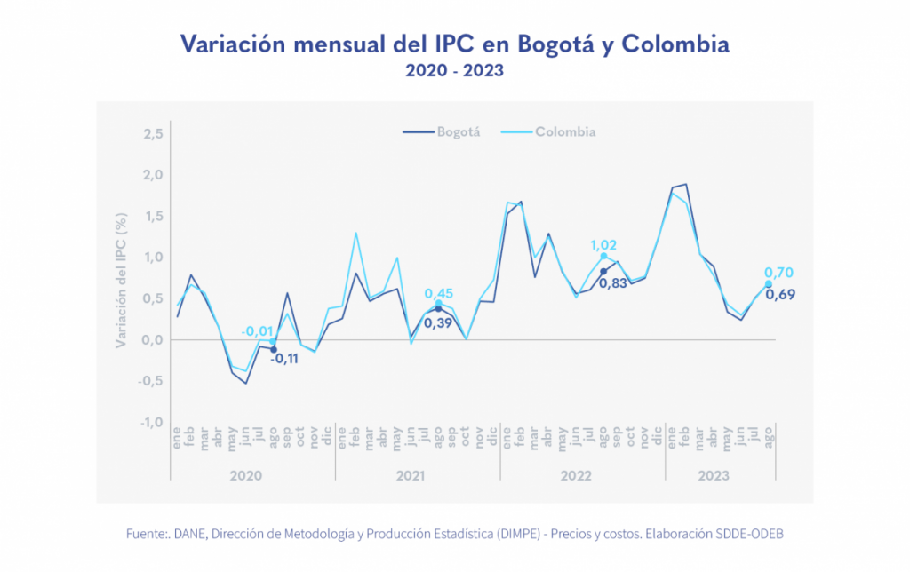 La inflación mensual en agosto de 2023 en Bogotá estuvo 0,14 puntos porcentuales (p.p.) por debajo del mismo periodo del año anterior.