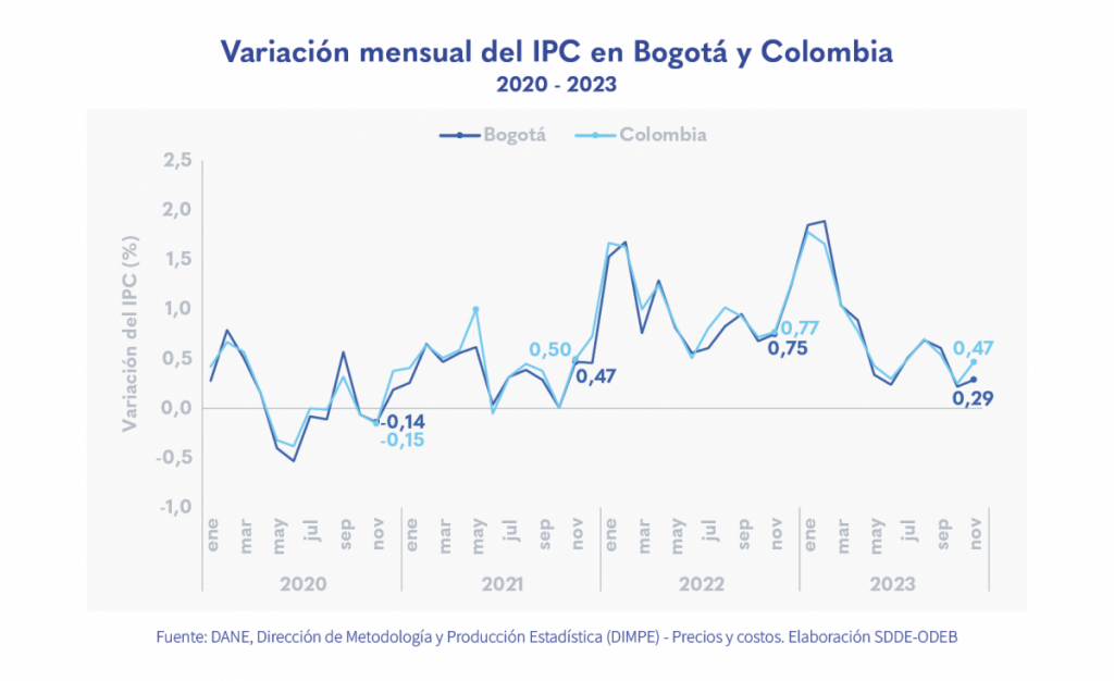En el periodo enero-noviembre de 2023, el incremento en el Índice de precios al consumidor (IPC) en Bogotá se ubicó 2,07 p.p. por debajo del mismo periodo del año anterior.