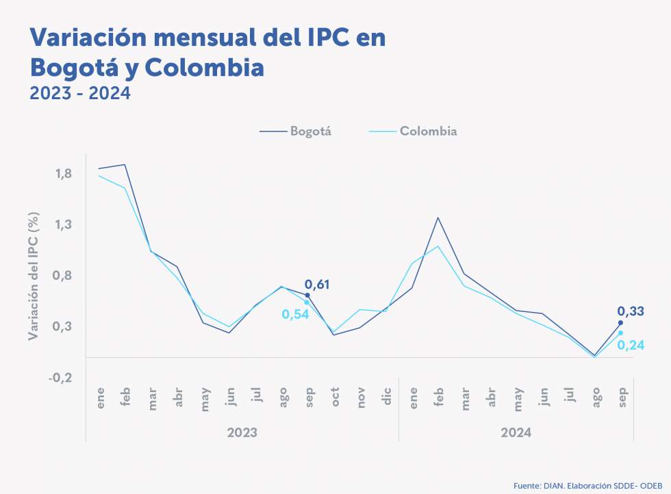 Published in: Boletines La inflación acumulada de Bogotá entre enero y septiembre fue de 5,08 % Author Observatorio Economico Published on: 9 de octubre de 2024 Destacados: La inflación mensual de la capital en septiembre de 2024 fue 0,33 %, 0,28 puntos porcentuales (p.p.) por debajo del mismo mes de 2023 (0,61 %). En educación y alojamiento se presentaron los mayores incrementos mensuales en septiembre de 2024. Archivo de descarga: Boletín inflación No.161 Temas: Inflación y gasto. Tipo de Publicación: Boletines