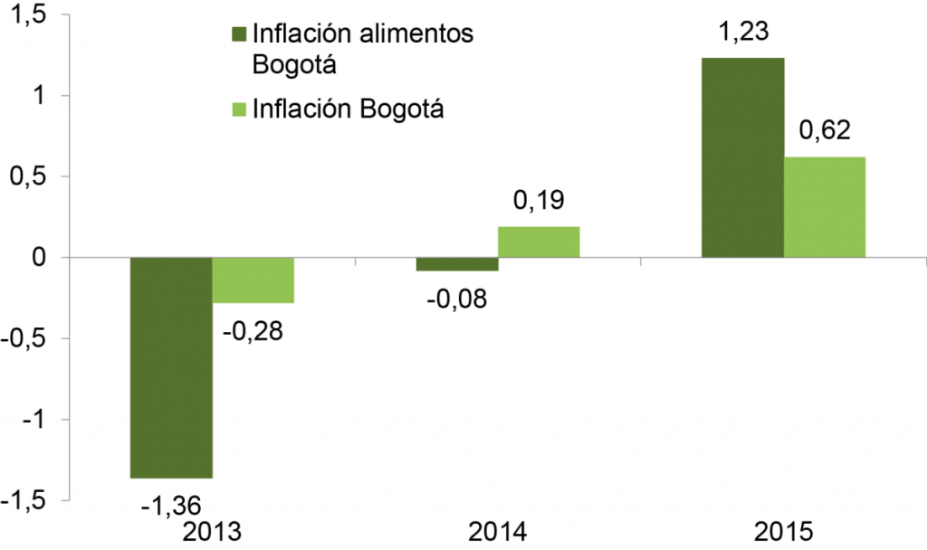 En el año, la inflación de Bogotá es de 5,40%, resultado superior a la misma fecha de 2014 (3,33%), e inferior a la inflación de Colombia (5,47%). Los alimentos que muestran una mayor contribución al alza de precios en el año son: almuerzo (5,18%), otras frutas frescas (32,74%), arroz (22,95%), fríjol (79,89%), otras hortalizas y legumbres frescas (55,58%). En el grupo vivienda, el índice de precios presentó un aumento en los arrendamientos y en la tarifa de energía eléctrica.