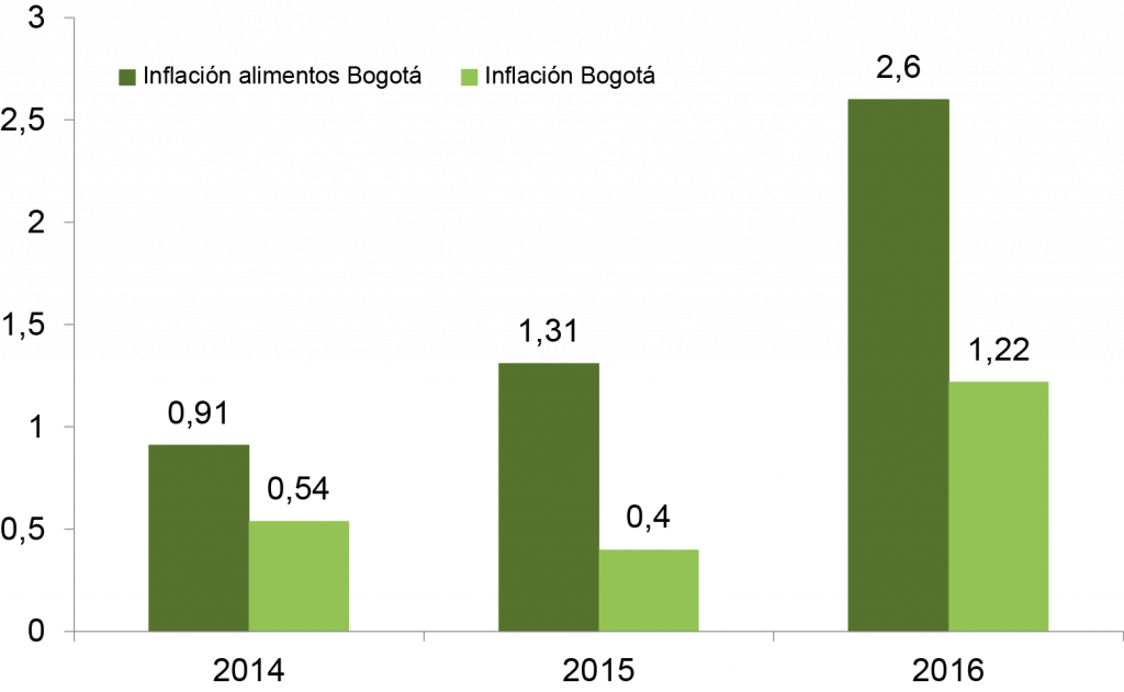 Alimentos fue el grupo que mayor aporte le hizo al IPC en Bogotá, la variación mensual fue de 2,60%. Los principales subgrupos de alimentos que aumentaron el costo de vida en la ciudad fueron: tubérculos y plátanos (24,08%); comidas fuera del hogar (1,79%); hortalizas y legumbres (3,99%). En el grupo vivienda se presentó alza en los arrendamientos, así como en todos los servicios públicos de gas doméstico y energía eléctrica.