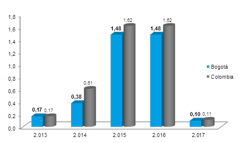 Published in: Boletines Inflación en Bogotá en marzo fue 0,58% Author Observatorio Economico Published on: 3 de mayo de 2017 Destacados: ·La inflación en el mes de marzo para Bogotá fue de 0,58%..·La inflación para la población de menores ingresos en Bogotá en marzo fue de 0,57%La inflación de Bogotá para el primer trimestre fue de 2,87%La inflación doce meses (abril 2016-marzo 2017) ascendió a 4,73%,·El IPC sin alimentos para el mes de marzo fue de 0,78%, mientras que en la nación fue 0,62%.El grupo que tuvo la mayor variación en la inflación del mes de marzo en Bogotá fue vivienda Archivo de descarga: Boletín inflación No.74 Temas: Inflación y gasto. Tipo de Publicación: Boletines