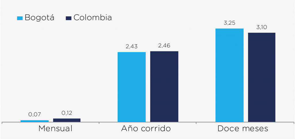 Published in: Boletines Inflación en el mes de agosto para Bogotá fue de 0,07% Author Observatorio Economico Published on: 21 de septiembre de 2018 Destacados: Inflación agosto 2018San Andrés -0,09%Bogotá 0,07%Colombia 0,12Barranquilla 0,14%Medellín 0,17%Cali 0,22%Sincelejo 0,76% Archivo de descarga: Boletín inflación No.90 Temas: Inflación y gasto. Tipo de Publicación: Boletines