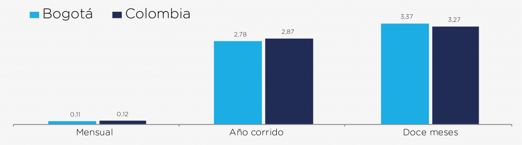 Published in: Boletines Inflación de Bogotá en el mes de noviembre 0,11% Author Observatorio Economico Published on: 24 de diciembre de 2018 Destacados: Con el resultado doce meses a noviembre de 2018 Bogotá es la sexta capital con mayor inflación, superada por ciudades comoBarranquilla 3,84Medellín 3,49Villavicencio 2,26Bogotá 3,37 Archivo de descarga: Boletín inflación No.93 Temas: Inflación y gasto. Tipo de Publicación: Boletines