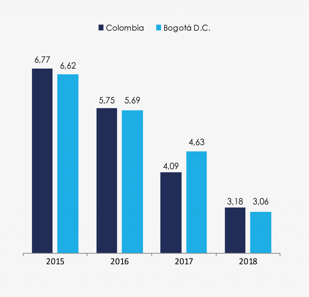 Published in: Boletines Inflación en Bogotá fue de 3,06% para el 2018 Author Observatorio Economico Published on: 14 de enero de 2019 Destacados: Inflación 2018Bogotá 3,06%Medellín 3,69%Barranquilla 3,69%Manizales 3,31%Cali 3,08% Archivo de descarga: Boletín inflación No.94 Temas: Inflación y gasto. Tipo de Publicación: Boletines