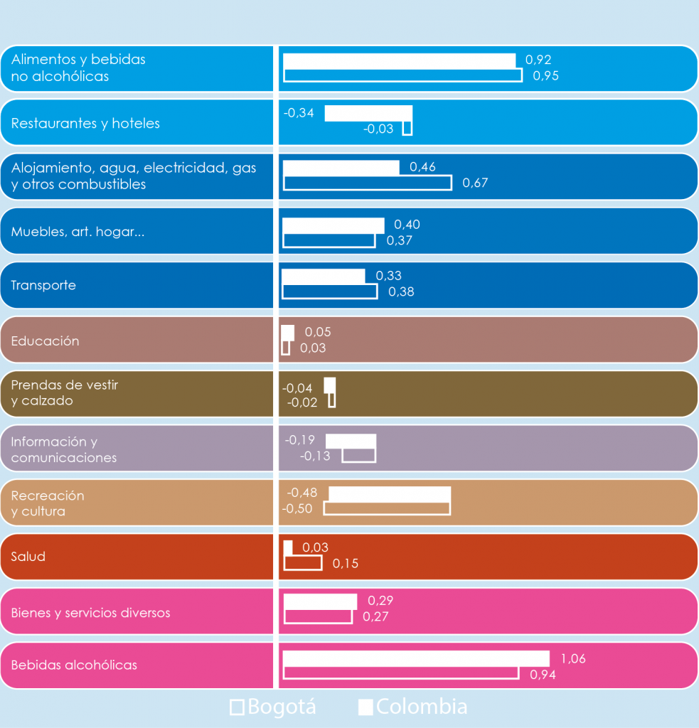 Published in: Boletines Bogotá registró una variación del IPC de 0,29% en marzo Author Observatorio Economico Published on: 27 de abril de 2019 Destacados: En Bogotá, las mayores contribuciones a la variación del IPC en abril 2019frutas 0,07 p.p.arriendo imputado 0,04 p.p.arriendo efectivo 0,03 p.p. Archivo de descarga: Boletín inflación No.97 Temas: Inflación y gasto. Tipo de Publicación: Boletines
