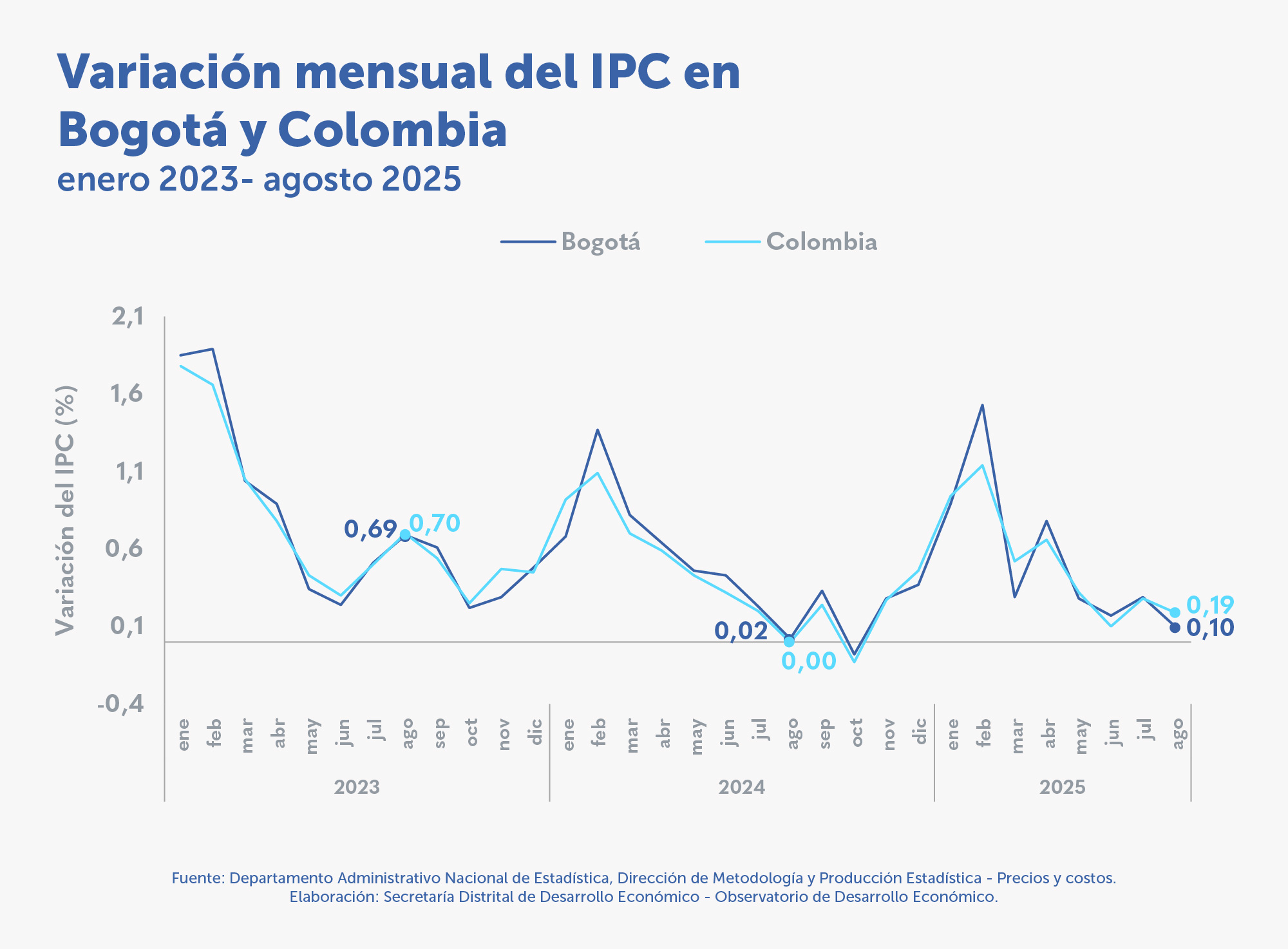 Published in: Boletines La inflación de Bogotá en agosto de 2025, fue de 0,10%; la más baja desde octubre del año anterior Author Federico Alberto Valdeblanquez Prieto Published on: 8 de septiembre de 2025 Destacados: La inflación en agosto de 2025 estuvo 0,08 puntos porcentuales (p.p.) por encima de la del mismo mes del año inmediatamente anterior (0,02 %).La inflación anual de la capital fue de 5,35 %, 1,07p.p. por debajo de la del mismo periodo del año inmediatamente anterior (6,42 %).En restaurantes y hoteles, así como en alimentos y bebidas no alcohólicas se presentaron los mayores aumentos mensuales. Archivo de descarga: Boletín inflación No.172 Temas: Inflación y gasto. Tipo de Publicación: Boletines