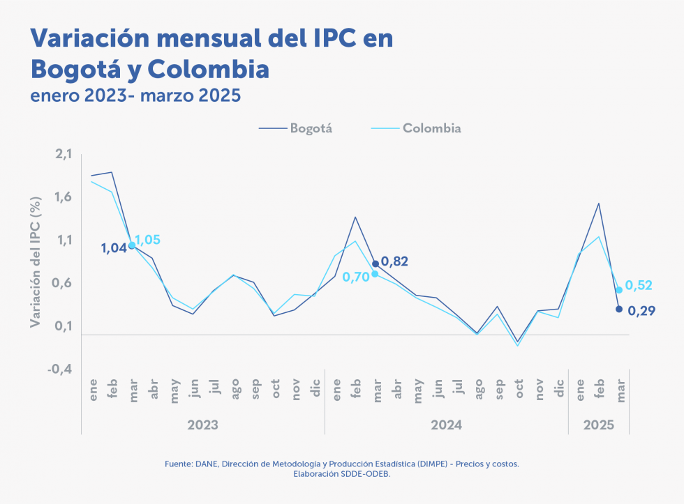 • La inflación en marzo de 2025 estuvo 0,53 puntos porcentuales (p.p.) por debajo de la del mismo mes del año inmediatamente anterior (0,82 %).