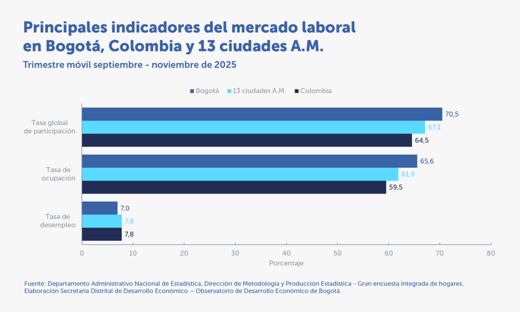 La población ocupada de Bogotá aumentó 140.112personas durante el trimestre móvil septiembre – noviembre de 2025 respecto al mismo periodo de 2024.