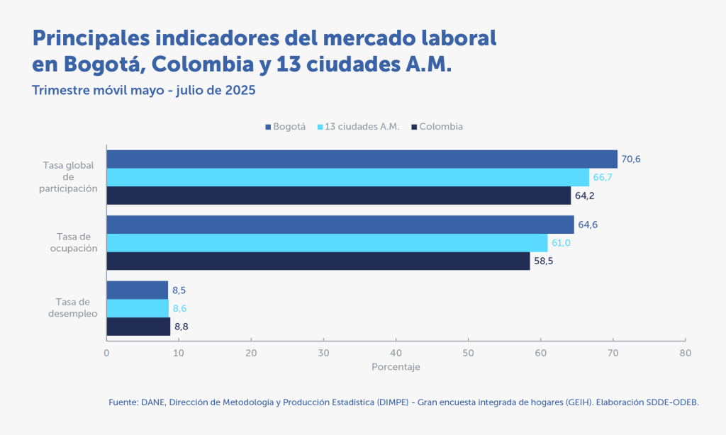 La población ocupada de Bogotá aumentó 44.234 personas durante el trimestre móvil mayo – junio de 2025 respecto al mismo periodo de 2024.