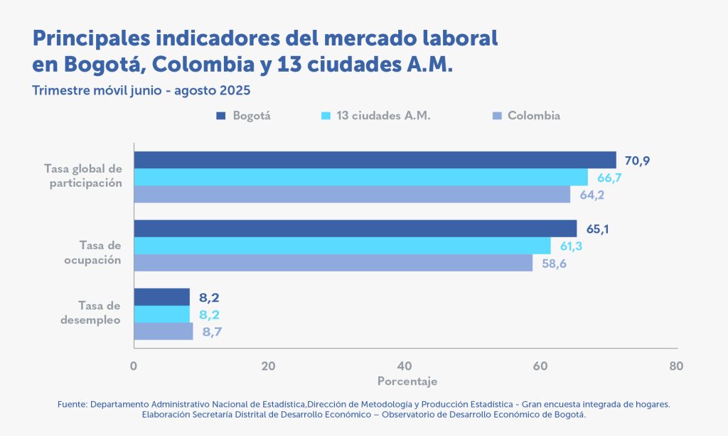 La población ocupada de Bogotá aumentó 78.819 personas durante el trimestre móvil junio – agosto de 2025 respecto al mismo periodo de 2024.