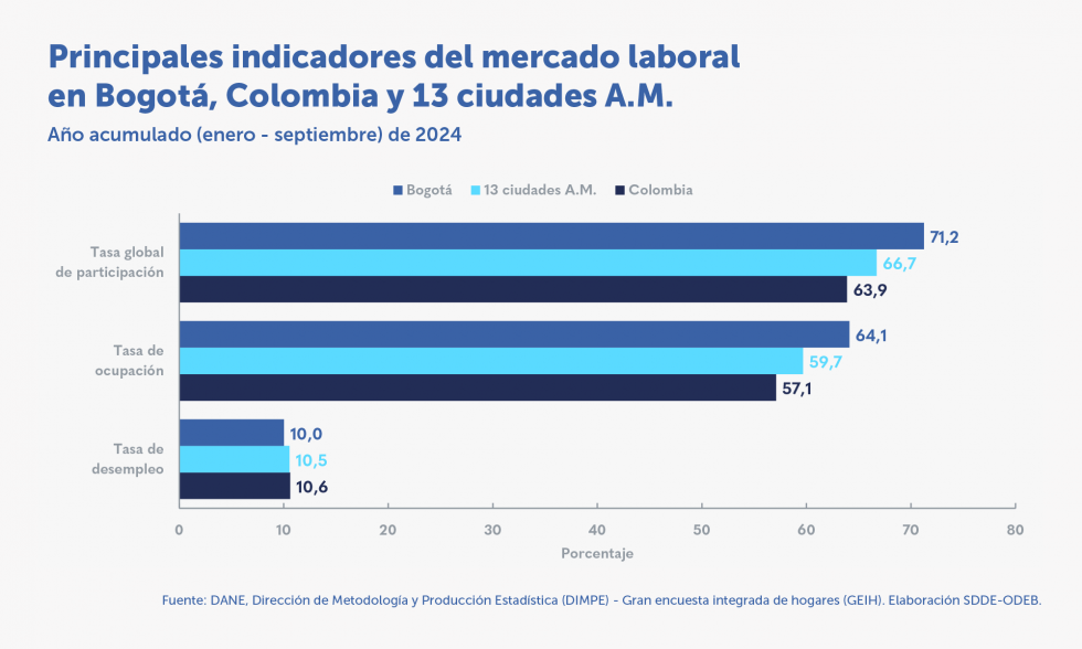 Durante el año acumulado 2024, la tasa de desempleo (TD) de Bogotá fue de 10,0 % y estuvo 0,6 puntos porcentuales (p.p.) por debajo del total nacional.