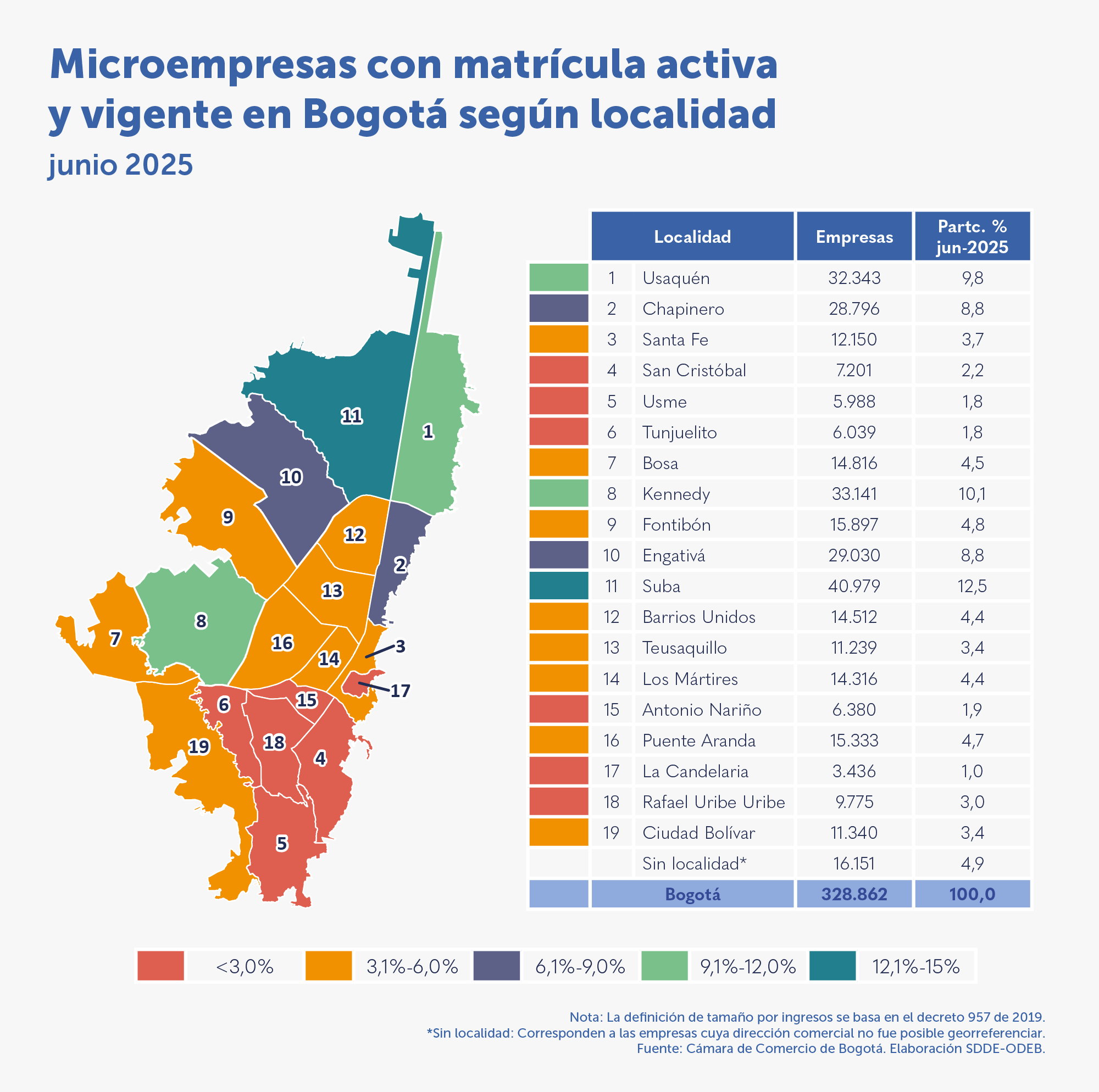 Published in: Boletines Las empresas dedicadas a los servicios crecieron 0,9 % en junio de 2025 Author Admin Observatorio Published on: 15 de julio de 2025 Destacados: Bogotá cerró junio de 2025 con 358.896 empresas activas y vigentes.Para el periodo de análisis, la participación de las empresas del sector comercio en el total de empresas activas y vigentes fue de 43,7 %.El 51,2 % de las empresas activas y vigentes pertenecieron a personas naturales con registro mercantil.En junio las empresas creadas por mujeres representaron 43,0 %. Archivo de descarga: Boletín dinámica empresarial No.49 Temas: Dinámica empresarial. Tipo de Publicación: Boletines
