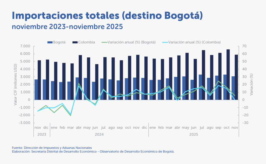 Las importaciones de bienes primarios registraron un incremento anual de 37,2 %, mientras que las de manufacturas aumentaron 3,1 % en noviembre de 2025.