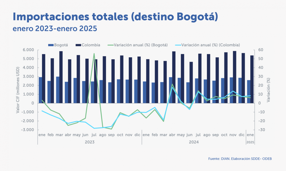 Published in: Boletines Las importaciones de Bogotá crecieron 6,2 % en enero de 2025 Author Observatorio Economico Published on: 7 de abril de 2025 Destacados: Las importaciones de bienes primarios registraron un incremento anual de 28,0 %, mientras que las manufacturas aumentaron 4,1 % en enero de 2025. En enero se observó un crecimiento anual de 13,6 % en las compras externas de productos químicos. Las importaciones desde Estados Unidos y China en enero de 2025 presentaron un aumento de 22,9 % y 17,6 % frente a enero de 2024. Archivo de descarga: Boletín Importaciones No. 151 Temas: Importaciones Tipo de Publicación: Boletines