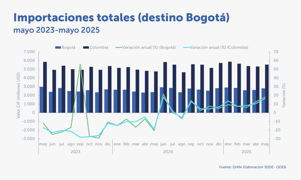 Published in: Boletines Las importaciones de Bogotá crecieron 7,1 % en mayo de 2025 Author Admin Observatorio Published on: 8 de agosto de 2025 Destacados: Las importaciones de manufacturas registraron un incremento anual de 8,9 %, mientras que los bienes primarios disminuyeron 20,1 % en mayo de 2025.En mayo se observó un crecimiento anual de 41,5 % en las compras externas de vehículos automotores.Las importaciones desde China y Brasil en mayo presentaron un aumento de 34,9 % y 25,3 % frente a mayo de 2024. Archivo de descarga: Boletín Importaciones No. 155 Temas: Importaciones Tipo de Publicación: Boletines