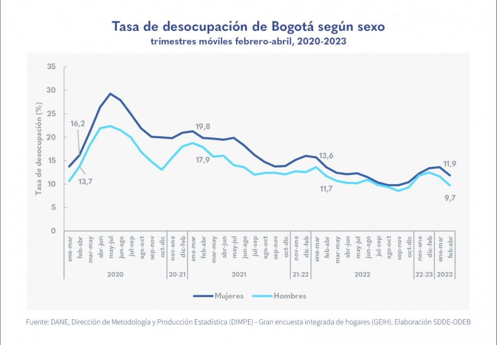 Published in: Boletines Cayó el desempleo de mujeres y hombres en el trimestre febrero-abril de 2023 Author Observatorio Economico Published on: 20 de junio de 2023 Destacados: En el trimestre febrero-abril de 2023, la población ocupada de las mujeres aumentó 3,0 % y la de los hombres, 5,6 %. La tasa de desocupación de la población joven disminuyó 3,7 puntos porcentuales (p.p.) respecto al mismo trimestre de 2022. La tasa de informalidad DANE disminuyó 2,0 p.p. respecto al mismo trimestre del año anterior. Archivo de descarga: Boletín mercado laboral especial No.103 Temas: Mercado laboral especial. Tipo de Publicación: Boletines