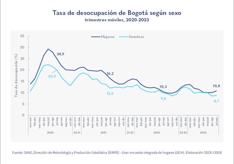 En el trimestre julio-septiembre de 2023, el número de mujeres en desocupación aumentó 11,4 %; mientras que, el de hombres disminuyó 4,7 %, en comparación con el mismo trimestre de 2022.