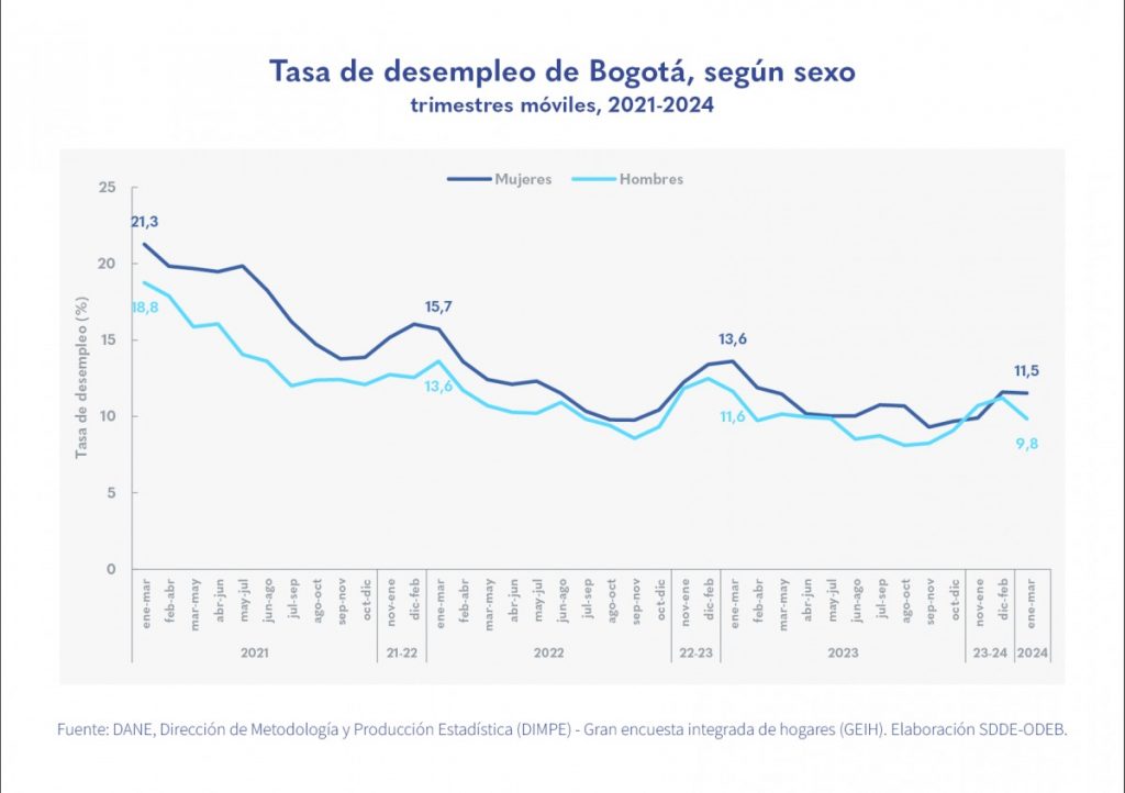Published in: Boletines En el primer trimestre del año, la tasa de desempleo de hombres y mujeres fue la más baja de los últimos ocho años en Bogotá Author Observatorio Economico Published on: 17 de mayo de 2024 Destacados: En el trimestre enero-marzo de 2024, la disminución en la tasa de desempleo de las mujeres fue mayor a la de los hombres. La tasa de desempleo de la población joven aumentó 1,4 puntos porcentuales (p.p.) respecto al periodo anterior. La tasa de informalidad fuerte2 de Bogotá disminuyó 1,0 p.p. en el periodo de análisis. Archivo de descarga: Boletín mercado laboral especial No.114 Temas: Mercado laboral especial. Tipo de Publicación: Boletines