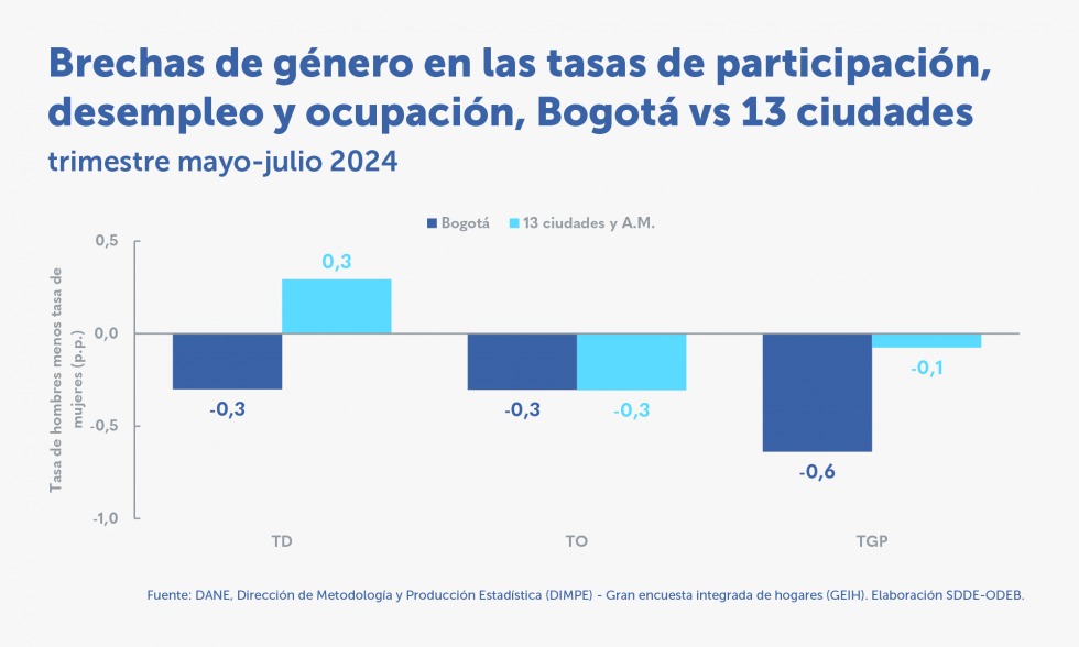 Published in: Boletines En el trimestre mayo-julio de 2024, la tasa de ocupación de las mujeres aumentó 2,1 p.p., respecto al mismo periodo de 2023 Author Observatorio Economico Published on: 17 de septiembre de 2024 Destacados: En el trimestre mayo-julio de 2024, el aumento en la tasa de ocupación de las mujeres fue mayor al de los hombres. En el mismo periodo, la tasa de ocupación de la población joven aumentó 1,7 puntos porcentuales (p.p.) respecto al periodo anterior. La tasa de informalidad de Bogotá se incrementó 1,0 p.p. en el periodo de análisis. Archivo de descarga: Boletín mercado laboral especial No.118 Temas:Mercado laboral especial Tipo de Publicación: Boletines
