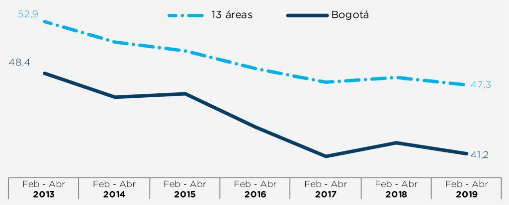 Published in: Boletines Disminuyó la informalidad fuerte a 41,2% en el trimestre móvil febrero – abril Author Observatorio Economico Published on: 12 de agosto de 2019 Destacados: Los sectores en donde más se empleó la población juvenil para el trimestre móvil febrero – abril de 2019Construcción (31%).Comercio (3,9%) Archivo de descarga: Boletín mercado laboral especial No.57 Temas: Mercado laboral especial. Tipo de Publicación: Boletines