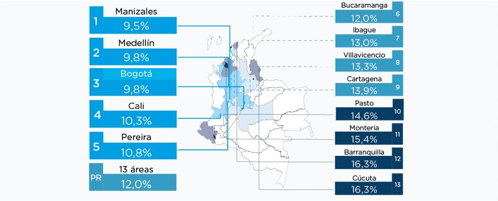 Published in: Boletines Bogotá es la tercera ciudad con menor tasa de informalidad fuerte para el trimestre mayo – julio de 2019 Author Observatorio Economico Published on: 15 de octubre de 2019 Destacados: La tasa de desocupación en las mujeres disminuyó en 0,1 puntos porcentuales, pasó de 11,9% en el trimestre móvil mayo – julio de 2018 a 11,8% en el mismo periodo de 2019. Archivo de descarga: Boletín mercado laboral especial No.60 Temas: Mercado laboral especial. Tipo de Publicación: Boletines